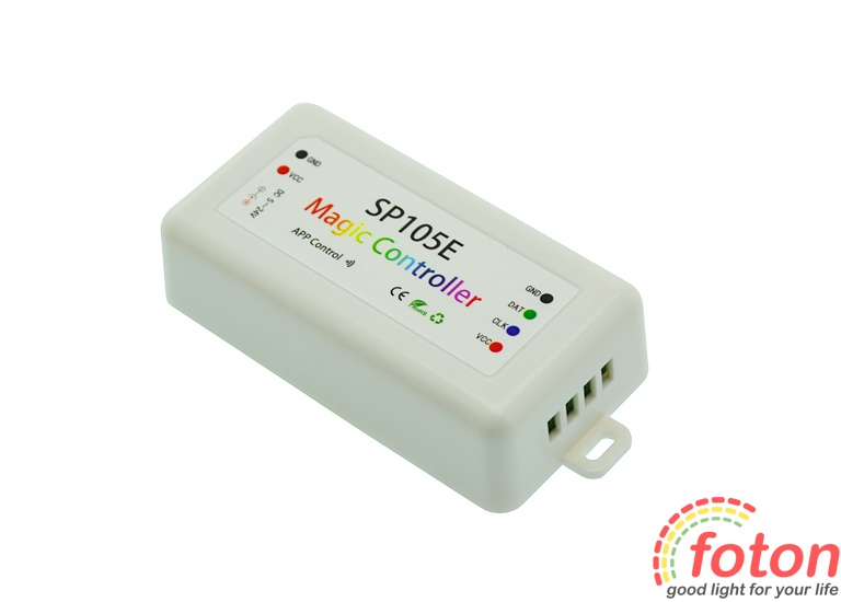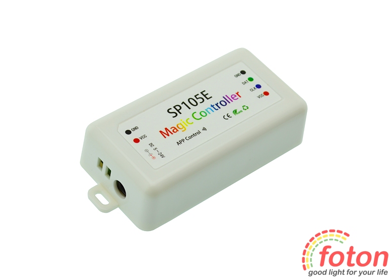 Контролер Bluetooth RGB Smart SP105E призначений для управління адресними (піксельними) світлодіодними led стрічками за допомогою з'єднання Bluetooth. Контролер представлений у білому пластиковому корпусі із необхідними роз'ємами для підключення. Робоча напруга від 5 до 24 вольт. До контролера можна підключити до 2048 пікселів.
