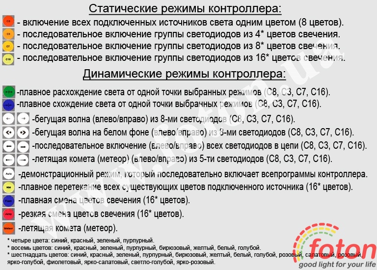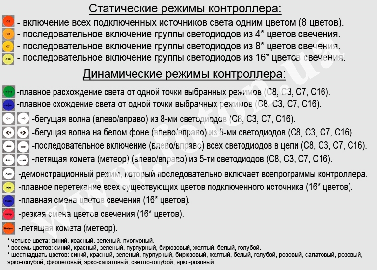 | Режими управління контролером: | IR HC303 IC RGB 6А |