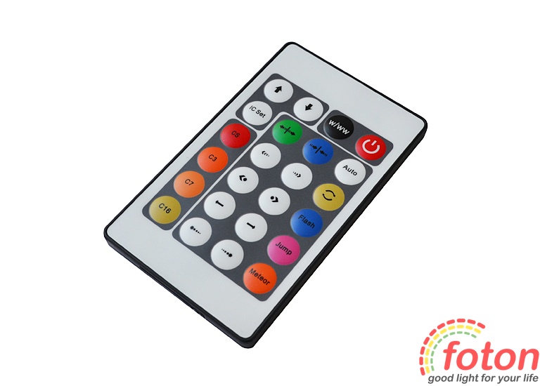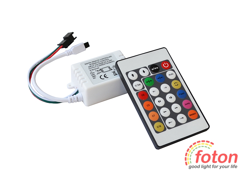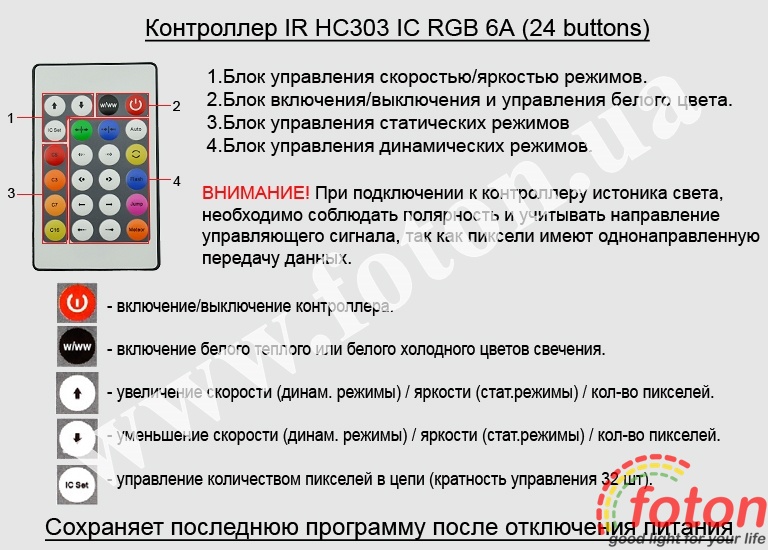 Контролер IR HC303 IC RGB 6А (24 buttons), максимальний вихідний струм 6А, інфрачервоне дистанційне управління. Радіус дії пульта до 10 метрів. WS2811. При підключенні до контролера джерела світла, необхідно дотримуватися полярності та враховувати напрямок керуючого сигналу, оскільки пікселі мають односпрямовану передачу даних.