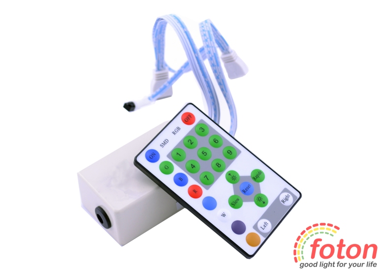 RGB Контролер має 9 динамічних режимів та 5 статичних режимів. Є можливість керування яскравістю стрічки в статичних режимах та швидкістю мерехтіння в динамічних режимах. Контролер зберігає останню програму після вимкнення живлення. Підходить для стрічки із загальним мінусом: "Біжуча хвиля 3LED.