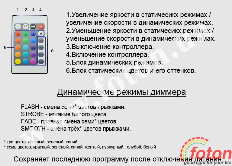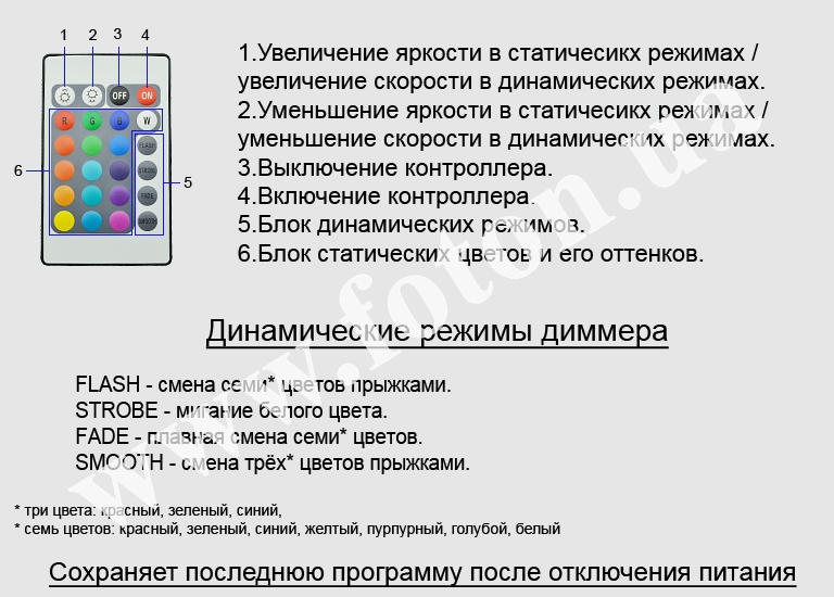 | Опис пульта та режимів контролера: | IR RGB 6А (24 buttons) |