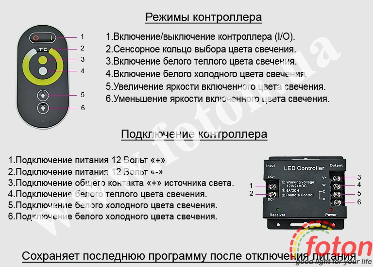 | Опис пульта та режимів контролера: | RF Multi White 12A Black (Touch) |