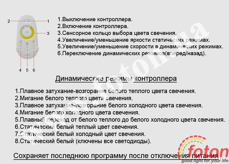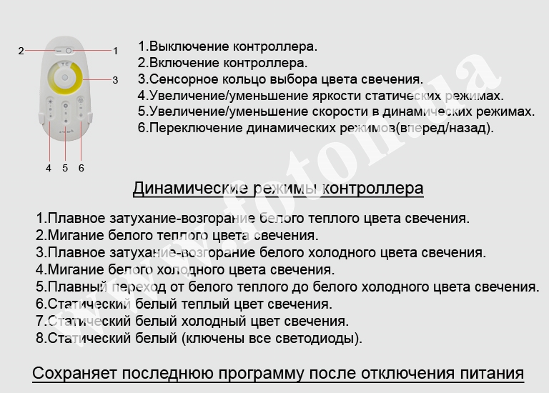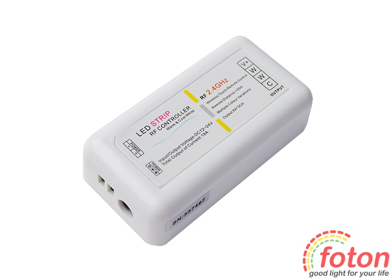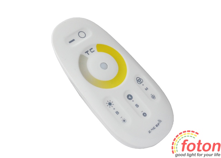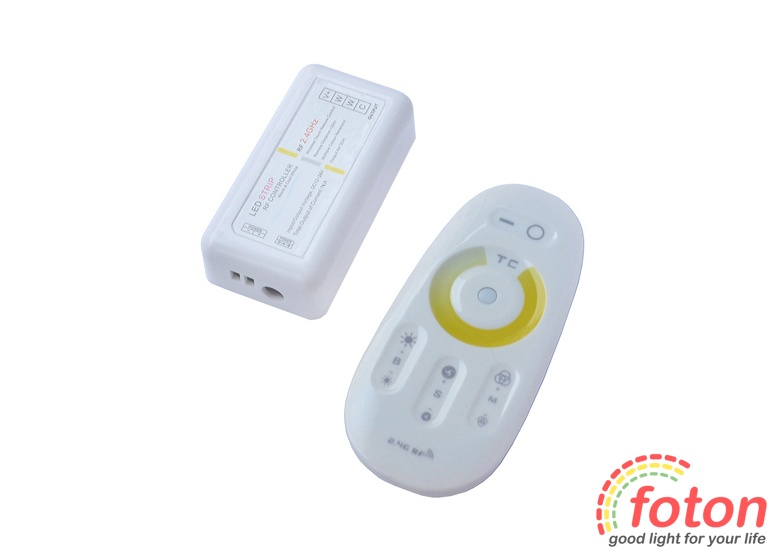 Функції контролера: - Увімкнення/вимкнення підсвічування; - Точне регулювання яскравості стрічки; - Можливість вибрати один із встановлених режимів яскравості; - Регулювання свічення стрічки від білого теплого до білого холодного.