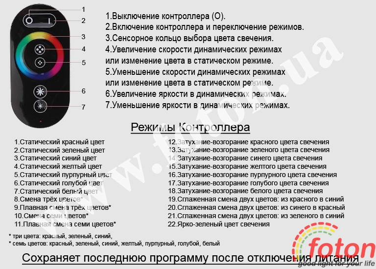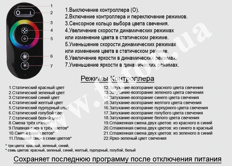 RGB Контролер має динамічні та статичні режими. Є можливість керування яскравістю стрічки в статичних режимах та швидкістю мерехтіння в динамічних режимах. Також цей контролер дає можливість точно регулювати відтінок кольору світіння за допомогою сенсорного кільця. Контролер зберігає останню програму після вимкнення живлення.