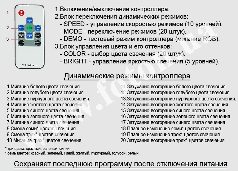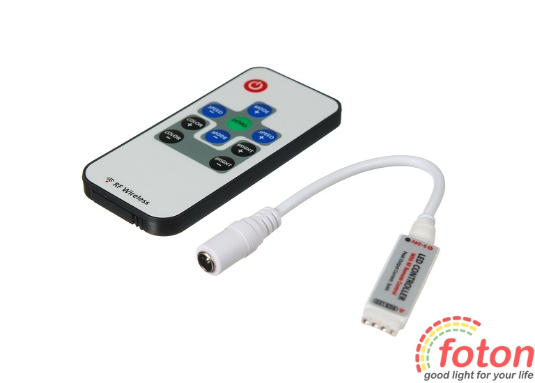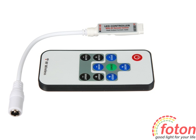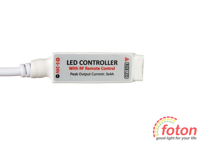 RGB Контролер має 20 динамічних режимів та 19 статичних режимів. Є можливість керування яскравістю стрічки в статичних режимах та швидкістю мерехтіння в динамічних режимах. Корпус контролера виконаний у вигляді мініатюрного приймача, що дозволяє встановити його будь-де. Контролер зберігає останню програму після вимкнення живлення.