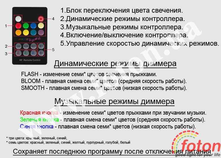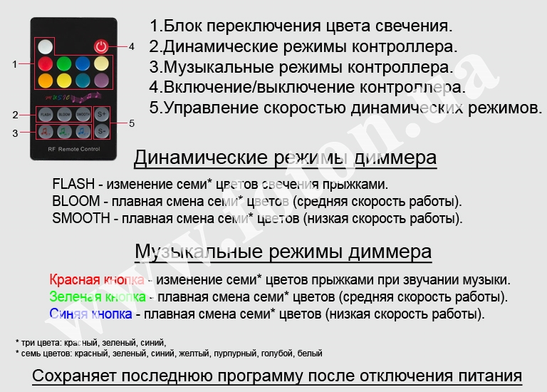 Контролер має 4 динамічні режими та 12 статичних режимів. Є можливість керування яскравістю стрічки в статичних режимах та швидкістю мерехтіння в динамічних режимах. Контролер зберігає останню програму після вимкнення живлення.