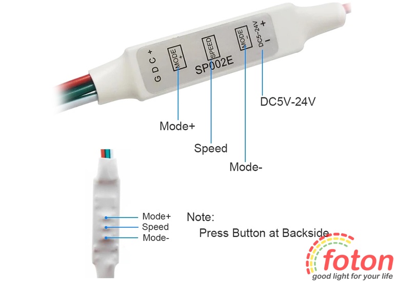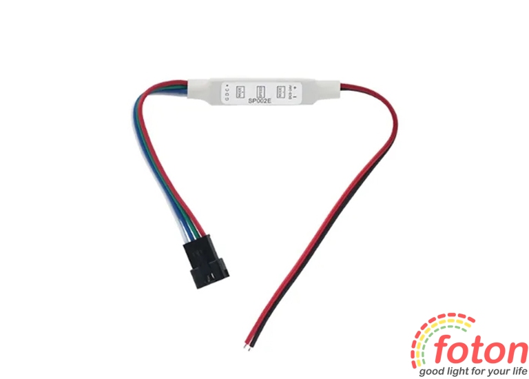 RGB Контролер має більше 76 програм та 5 рівнів швидкості для керування пікселями. За допомогою певних програм можна регулювати відтінок кольору світіння. Контролер зберігає останню програму після вимкнення живлення. Цифровий контролер дозволяє управляти до 2048 пікселів. Робоча напруга контролера 5 вольт. Підключення до led модулів або led стрічці через конектор 3pin.