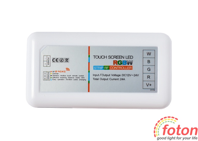 Контролер RF RGBW 24А White (Touch Screen) призначений для керування світлодіодною стрічкою RGB+W. За допомогою цього контролера можна вибрати потрібний відтінок світіння. Радіус дії пульта до 20 метрів.