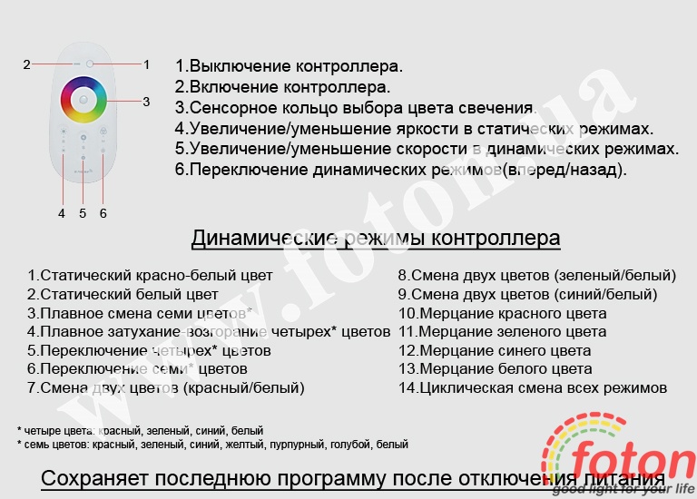 RGB Контролер має динамічні та статичні режими роботи. Є можливість керування яскравістю стрічки в статичних режимах та швидкістю мерехтіння в динамічних режимах. Також цей контролер дає можливість точно регулювати відтінок кольору світіння за допомогою сенсорного кільця. Контролер зберігає останню програму після вимкнення живлення.