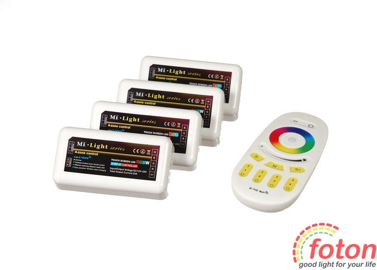 Контролер RF RGBW 24A, 4 zones, White (Touch) це контролер, який дозволяє керувати чотирма різними зонами освітлення одночасно. За допомогою даного контролера можна вибрати зону, в якій проводитиметься регулювання освітлення. Радіус дії пульта до 100 метрів.