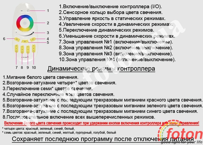 | Опис пульта та режимів контролера: | RF RGB 18A, 4 zone, White (Touch) |