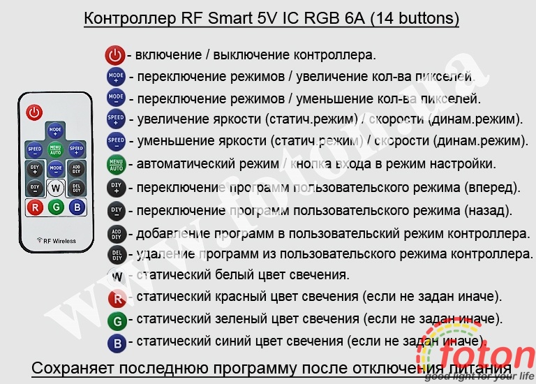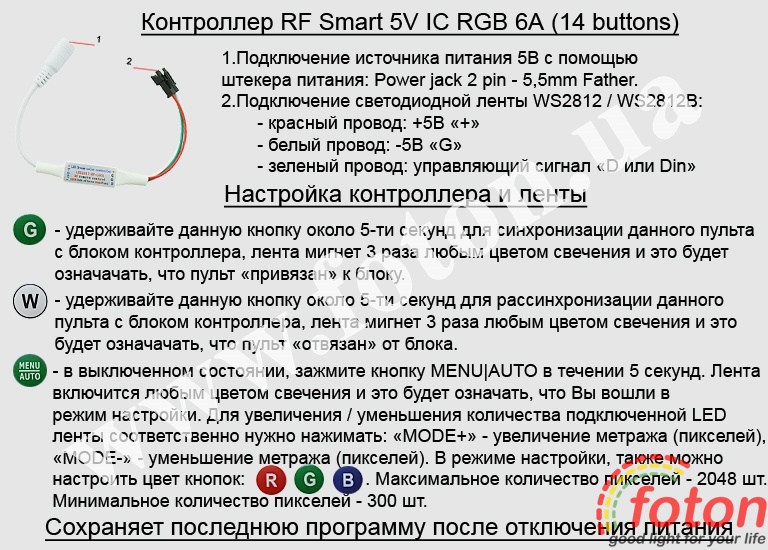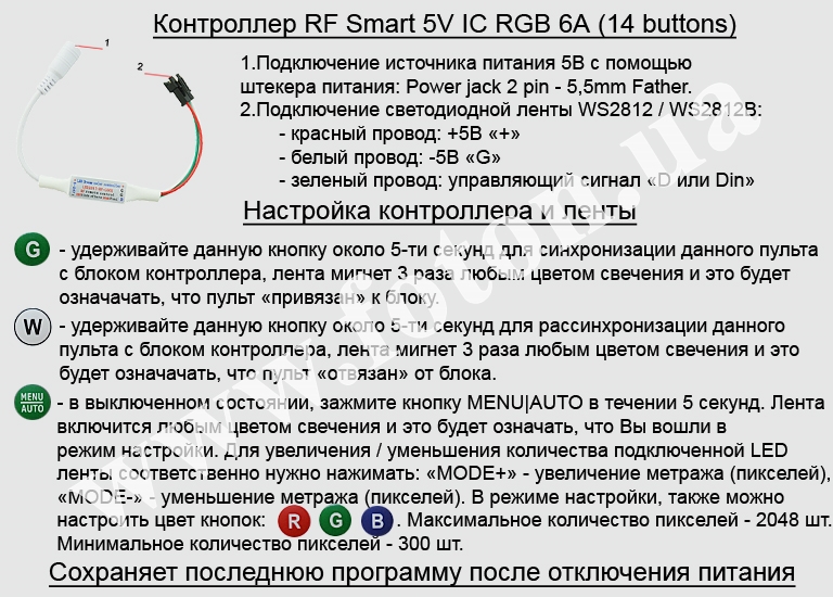| Підключення контролера: | RF Smart 5V IC RGB 6А (14 buttons) |