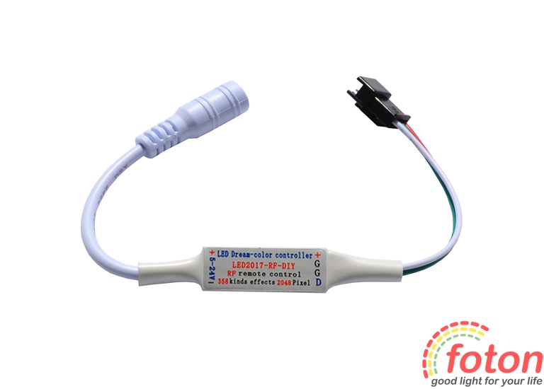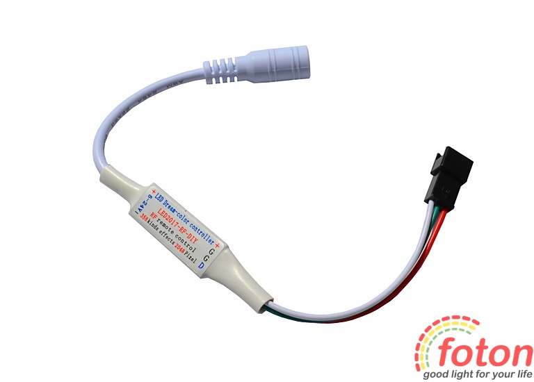 RGB Контролер має більше 300 програм та 64 рівнів швидкості для керування пікселями. За допомогою певних програм можна регулювати відтінок кольору світіння. Контролер зберігає останню програму після вимкнення живлення. Цифровий контролер дозволяє управляти до 2048 пікселів. Робоча напруга контролера 5 вольт, підключення здійснюється через роз'єм Power jack 2pin – 5,5mm Father. Підключення до led модулів або led стрічці через конектор 3pin.