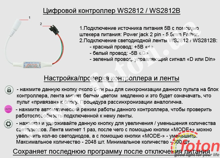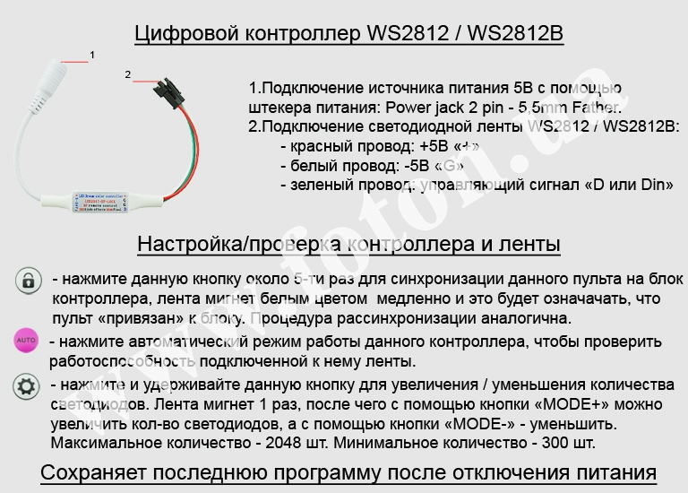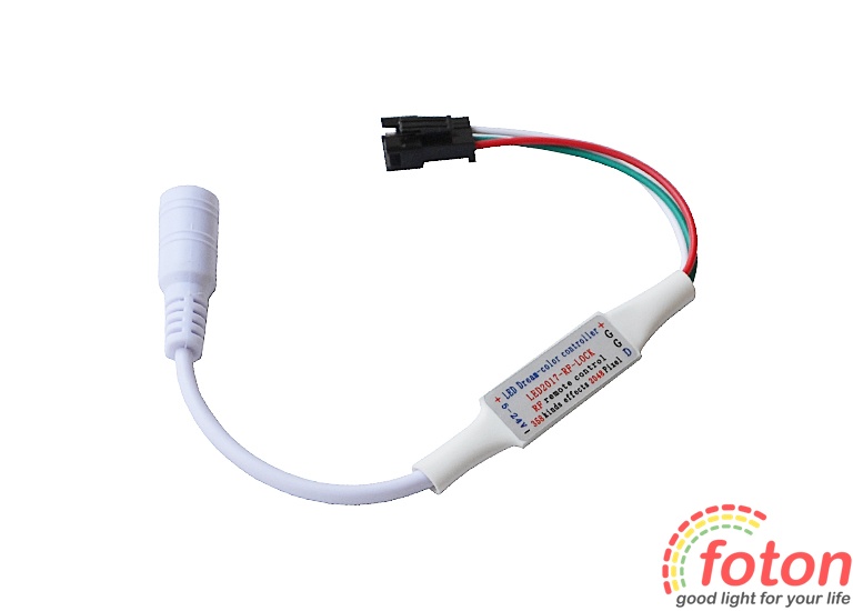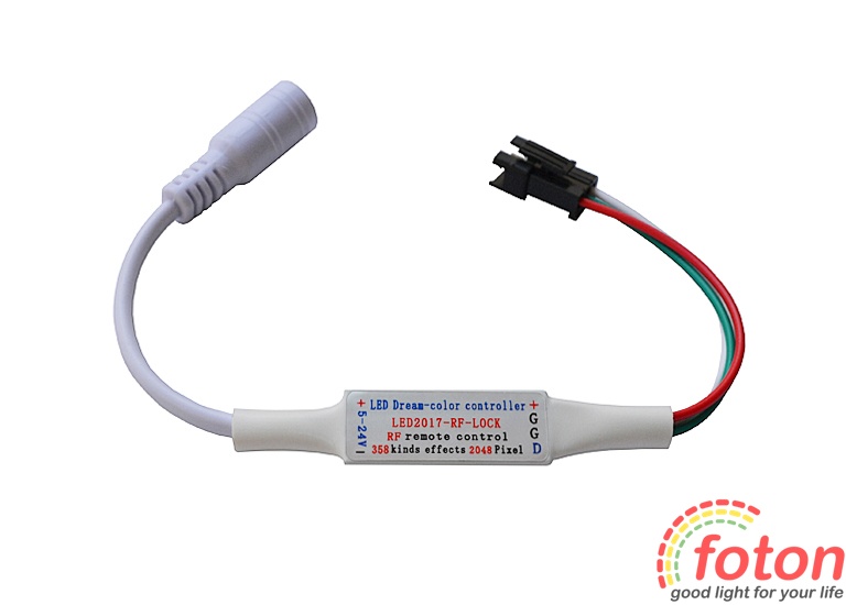 RGB Контролер має більше 300 програм та 64 рівнів швидкості для керування пікселями. За допомогою певних програм можна регулювати відтінок кольору світіння. Контролер зберігає останню програму після вимкнення живлення. Цифровий контролер дозволяє управляти до 2048 пікселів. Робоча напруга контролера 5 вольт, підключення здійснюється через роз'єм Power jack 2pin – 5,5mm Father. Підключення до led модулів або led стрічці через конектор 3pin.