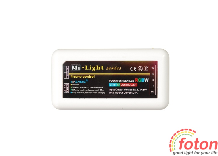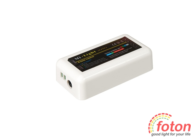 Блок контролера RGB 24A, 4 zones. Керування контролером здійснюється за допомогою пульта дистанційного керування з сенсорними кнопками (постачається окремо). До одного такого пульта можна підключити до чотирьох блоків управління, що дасть можливість, незалежно один від одного, керувати одним пультом чотирма зонами освітлення. Радіус дії пульта до 100 метрів.