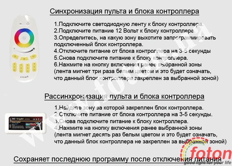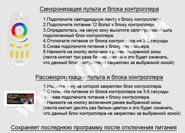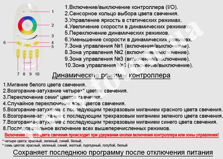 | Опис пульта та режимів контролера: | RF RGB 18A, 4 zone, White (Touch) |