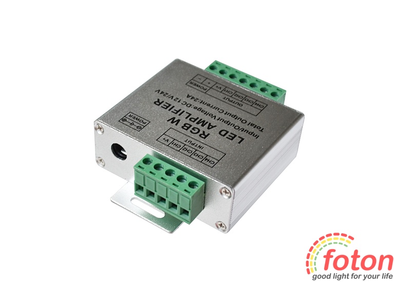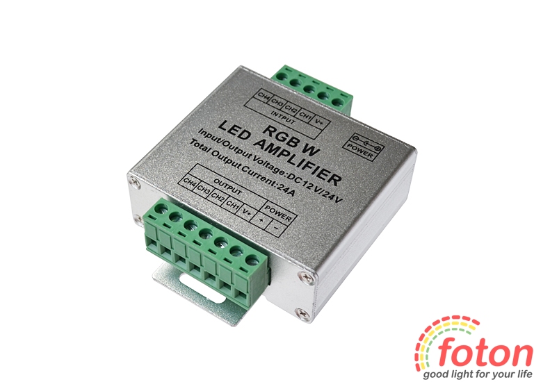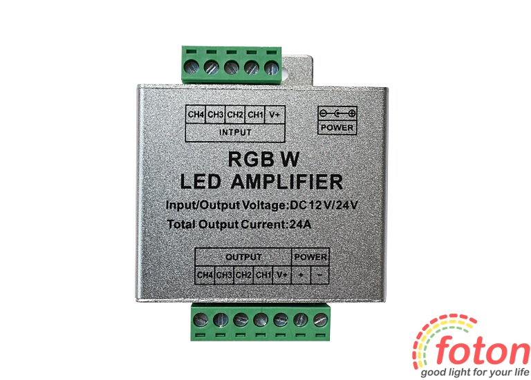 RGBW підсилювач 24А призначений для збільшення довжини світлодіодної стрічки, що підключається до одного контролера RGBW. Робоча напруга 12В, вихідний струм 24А.