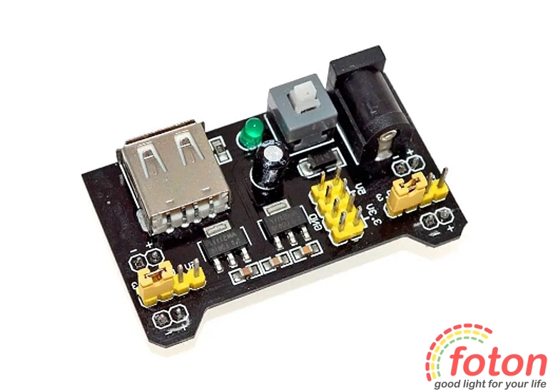 Основна перевага плати – її універсальність, що дозволяє подавати напруги одразу на доріжки, контакти макетної плати. Модуль може живитися від порту USB або від зовнішнього джерела живлення 7-12 В. Модуль живлення має дві незалежні лінії живлення, які можна налаштувати на вихідну напругу 5 В або 3,3 В, або повністю відключити живлення від лінії. Модуль має перемикач ВКЛ/ВИМК для включення та вимикання модуля.