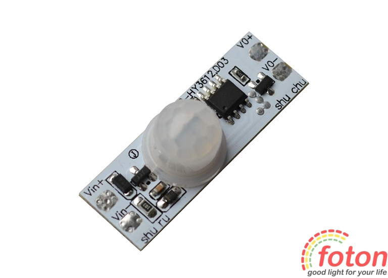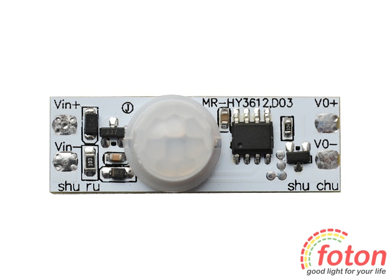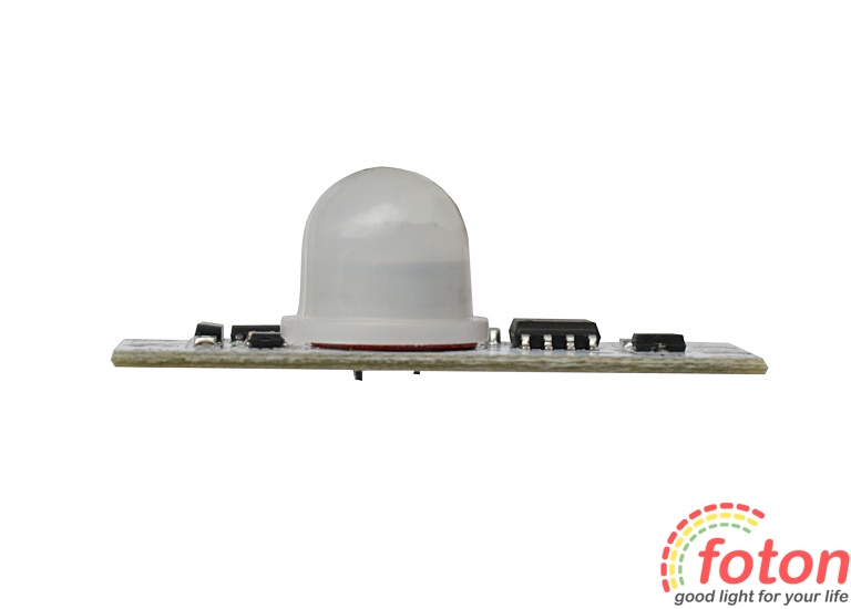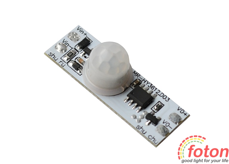 Датчик виконаний у вигляді друкованої плати без корпусу, габаритні розміри якої дозволяють помістити її у світлодіодний профіль. Датчик руху 12В активний як у денний, так і в нічний час. Після виявлення руху в контрольованому секторі датчик сприяє включенню джерела світла 12В (світлодіодна стрічка, світлодіодна лінійка, прожектор). Час затримки увімкненого світла становить 40 секунд +/- 5 секунд., але якщо в проміжку цього часу датчик бачитиме рух, то свічення джерела продовжуватиметься.