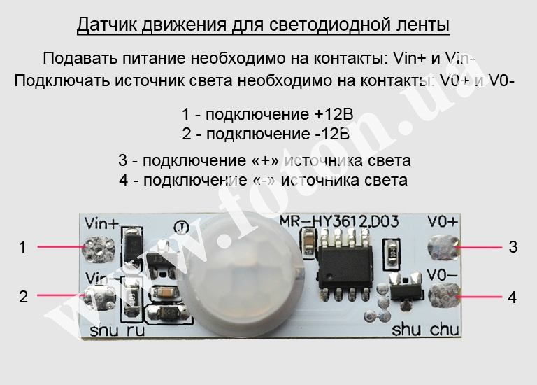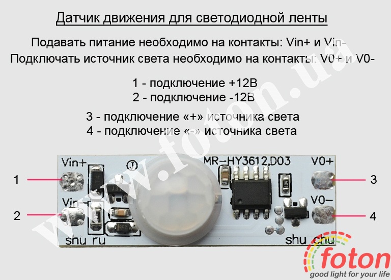 Для підключення датчика потрібно виконати пайку контактів. З одного боку ("Vin+", "Vin-") потрібно подати напругу 12 вольт, з іншого боку ("VO+", "VO-") підключити світлодіодну стрічку 12В. Якщо після підключення побачите свічення сигнального світлодіода, підключення виконано правильно.