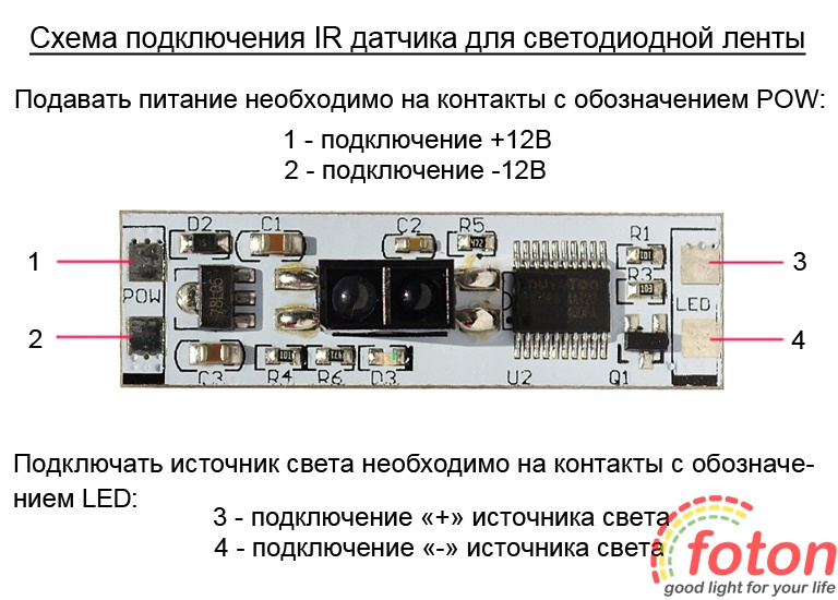 Для підключення датчика потрібно виконати пайку контактів. З одного боку (V in + V in) потрібно подати напругу 12 вольт, з іншого боку (V0 + V0) підключити світлодіодну стрічку 12В. Якщо після підключення побачите свічення сигнального світлодіода, підключення виконано правильно. При установці ІЧ датчика важливо убезпечити його від замикання контактів з нижньої сторони. Для цього виконується ізоляція поверхні, матеріалом, який не проводить струм.