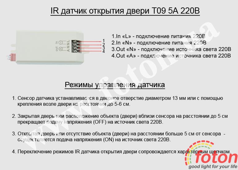| Схема підключення: | IR Door Sensor switch T09 5А 220V |