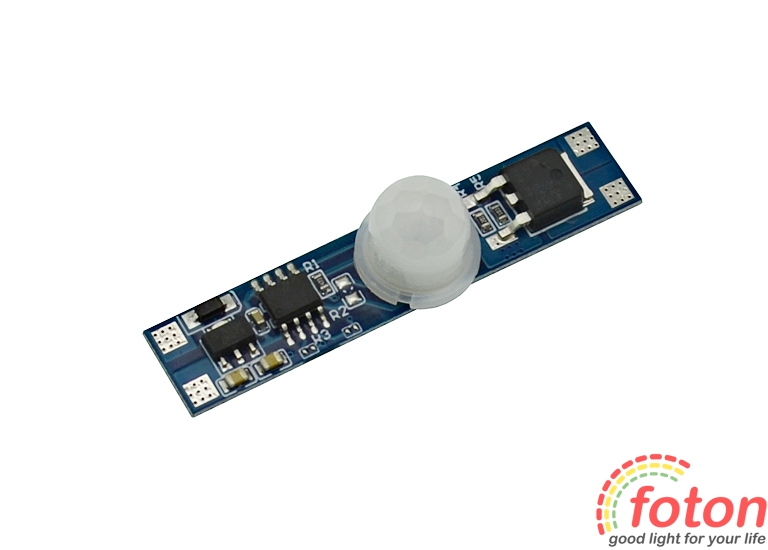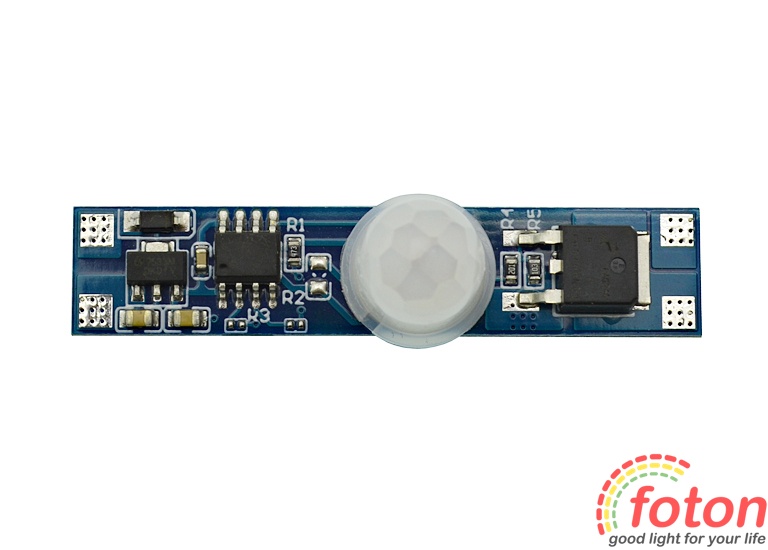 Датчик виконаний у вигляді друкованої плати без корпусу, габаритні розміри якої дозволяють помістити її у світлодіодний профіль. Датчик руху 12В активний як у денний, так і в нічний час. Після виявлення руху в контрольованому секторі датчик сприяє включенню джерела світла 12В (світлодіодна стрічка, світлодіодна лінійка, світлодіоди). Час затримки увімкненого світла становить 30 секунд +/- 10 секунд., але якщо в проміжку цього часу датчик бачитиме рух, то час свічення джерела продовжуватиметься.