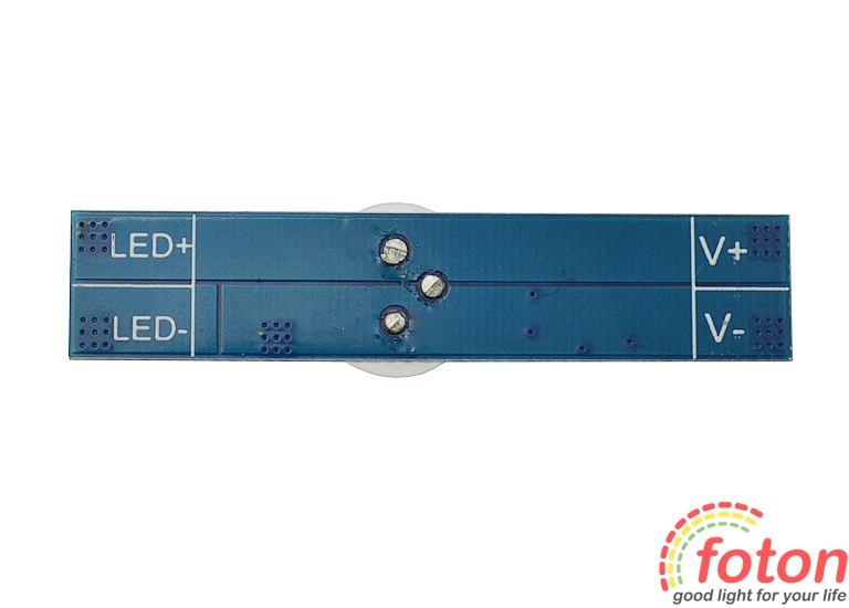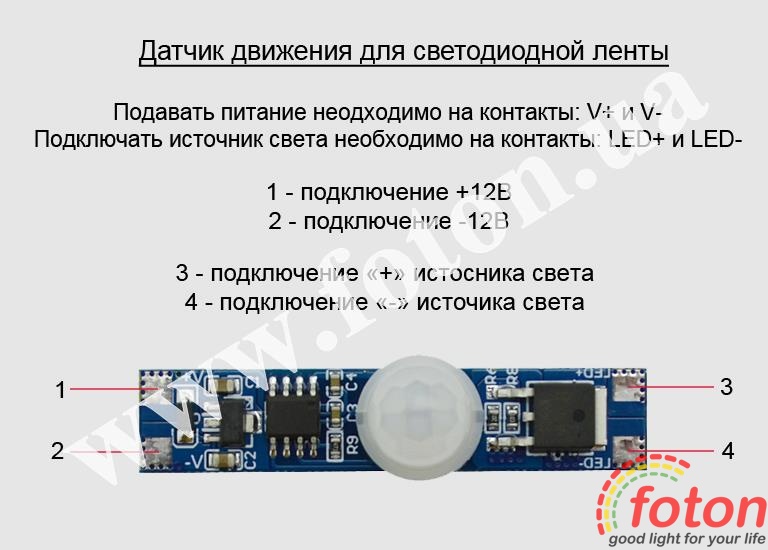 Для підключення датчика потрібно виконати пайку контактів. З одного боку ("V+", "V-") потрібно подати напругу 12 вольт, з іншого боку ("LED+", "LED-") підключити світлодіодну стрічку 12В