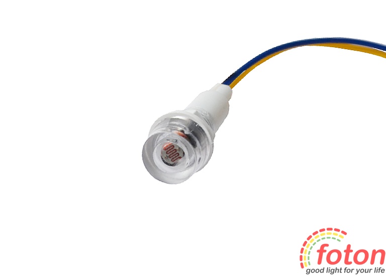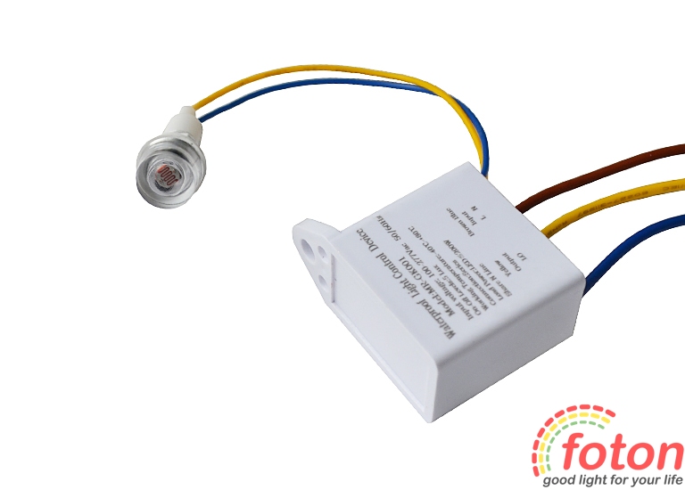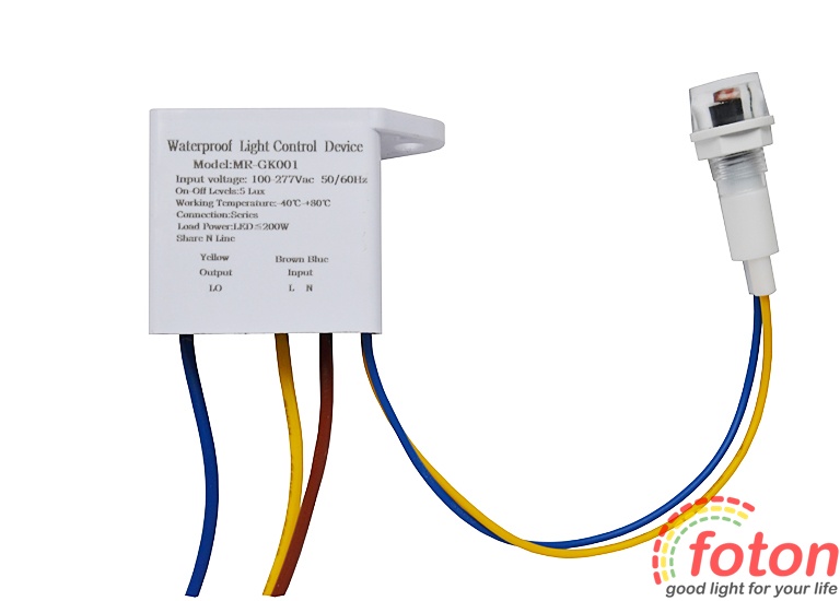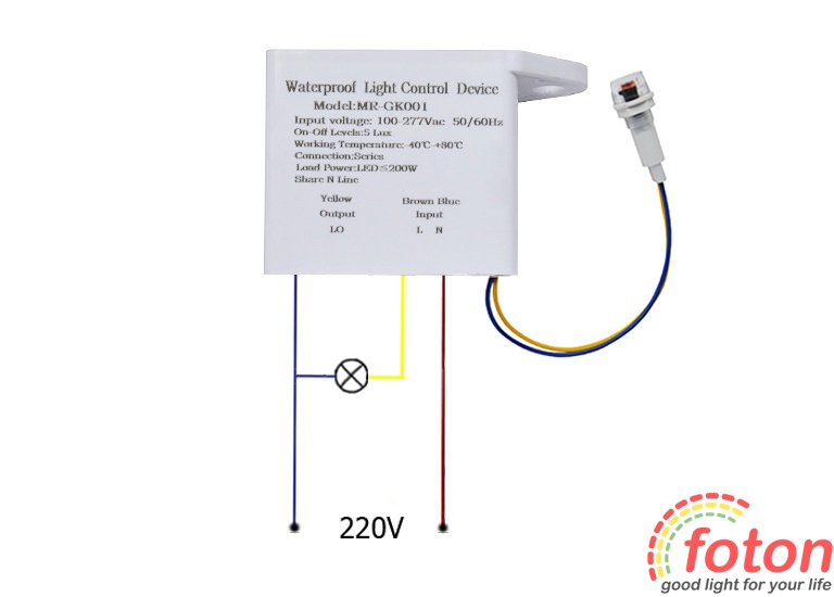 Цей пристрій має виносний датчик, який можна встановити в монтажний отвір діаметром 10мм. Для монтажу сутінкового датчика FT-MR-GK001 необхідно виконати наступне підключення: два дроти (синій та коричневий) призначені для підключення вхідної напруги 220В ("L", "N"), жовтий та синій провід служать для підключення led джерела свічення. Зауважте, що синій провід використовується як для входу, так і для виходу на джерело світла.