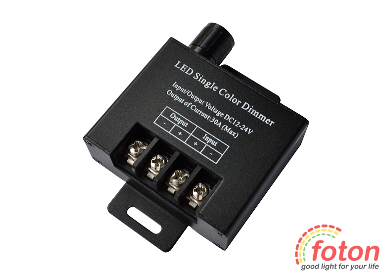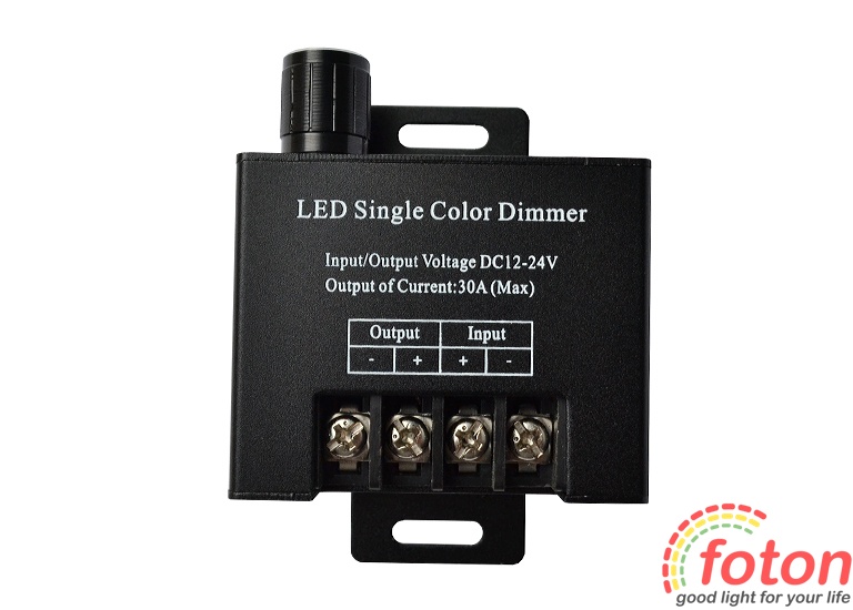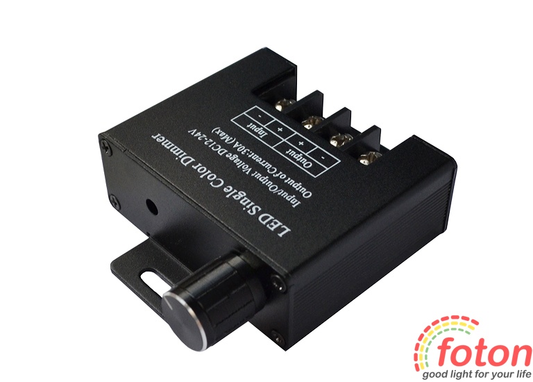 Діммер DMR 12V, 30A для монохромної світлодіодної стрічки.Він призначений для плавного регулювання яскравості світла світлодіодної стрічки в діапазоні від 1% до 100%. Управління яскравістю здійснюється вручну за допомогою регулятора діаметром 15 мм, який розташований на корпусі світлорегулятора.