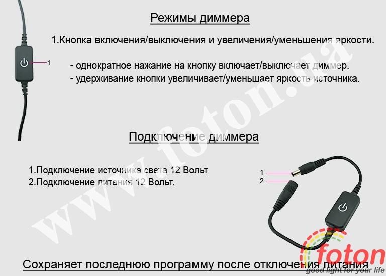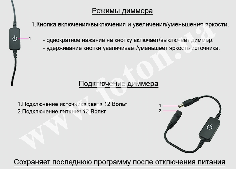 Вихідна напруга - 12 В, максимальний струм - 4 А. Діммер для світлодіодної стрічки зберігає останню програму після вимкнення живлення. Для підключення цей димер має роз'єми Power jack 5,5mm Mother і Power jack 5,5mm Mother Father, що значно спрощує монтаж.