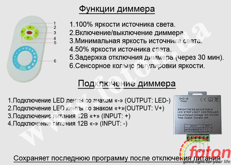 | Опис пульта, режимів димера та підключення: | RF DMR 12V, 10A (Touch) |