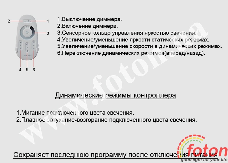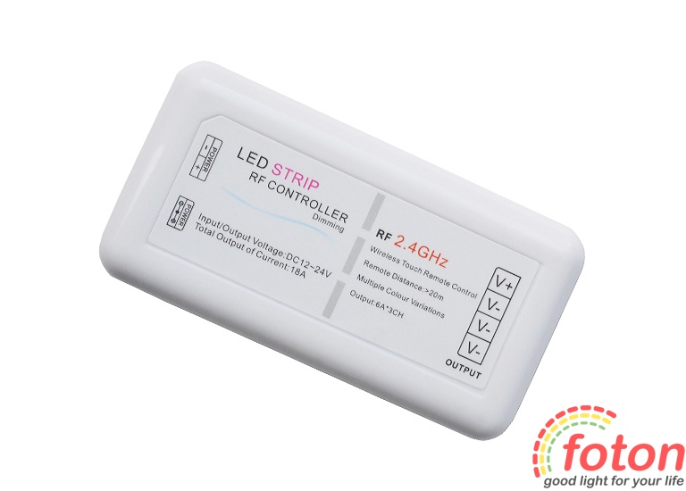 Вихідна напруга - 12 В, максимальний струм - 18 А. Даний димер зберігає останню програму після вимкнення живлення. Радіо хвиля диммера може перетинатися з іншими радіочастотами таких самих пристроїв.