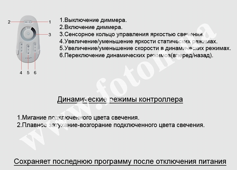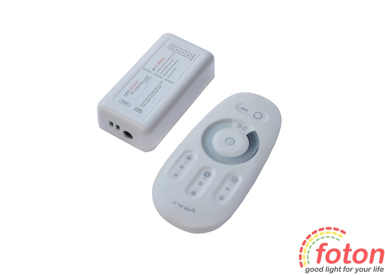 Діммер RF DMR 12V, 18A (Touch) для монохромної світлодіодної стрічки. Призначений для плавного регулювання яскравості світла світлодіодної стрічки в діапазоні від 1% до 100%. Також, даний диммер має динамічні режими, в яких можна керувати швидкістю мерехтіння. Плавне регулювання яскравості виконується за допомогою сенсорного кільця. Радіус дії пульта 30 метрів.