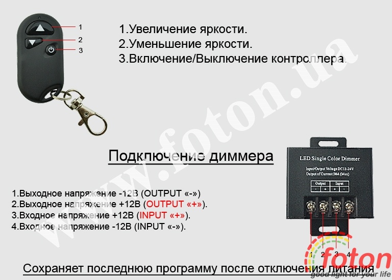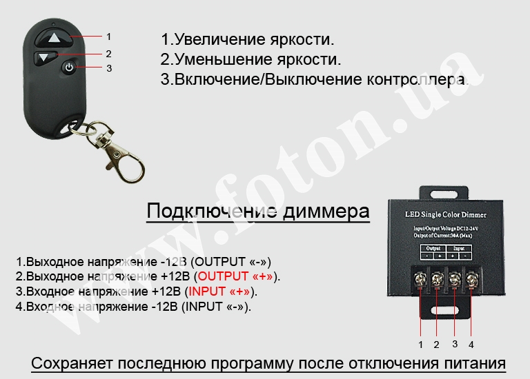 | Опис пульта та режимів димера: | RF DMR 12V, 30A |