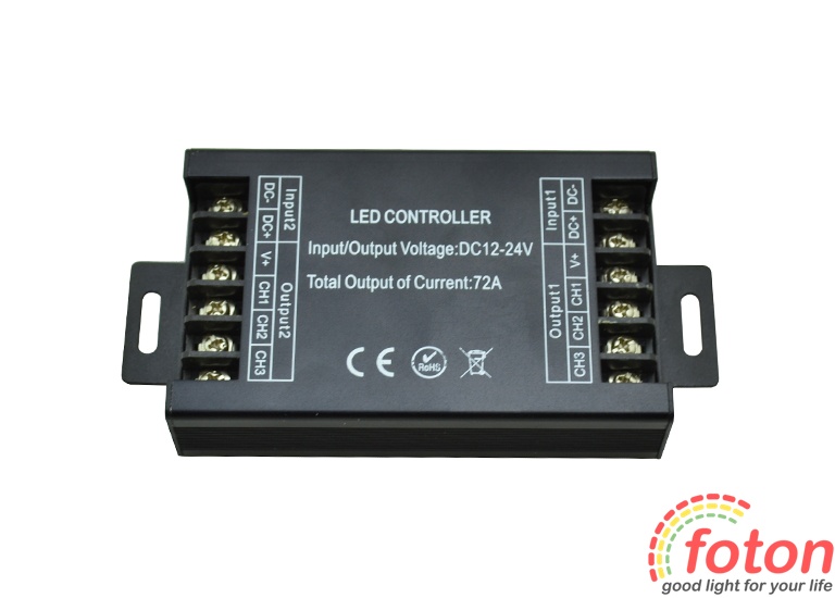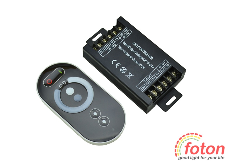 Вихідна напруга - 12 В, максимальний струм - 72 А. Даний димер зберігає останню програму після вимкнення живлення. Радіо хвиля диммера може перетинатися з іншими радіочастотами таких самих пристроїв. Для підключення димера використовуються гвинтові клеми. На звороті розташовані роз'єми RG45, вони призначені для синхронізації димерів між собою. Роз'єми RJ45 дозволяють синхронізувати роботу одночасно кількох димерів. Ця функція буде корисною, якщо потужності одного димера недостатньо або, якщо кероване освітлення знаходиться поза зоною досяжності пульта. При такому підключенні пульт керує головним диммером. Інші димери працюють у режимі репітерів (повторників), передаючи сигнал на свої відрізки стрічки, отримуючи його по LAN кабелю від головного димера.