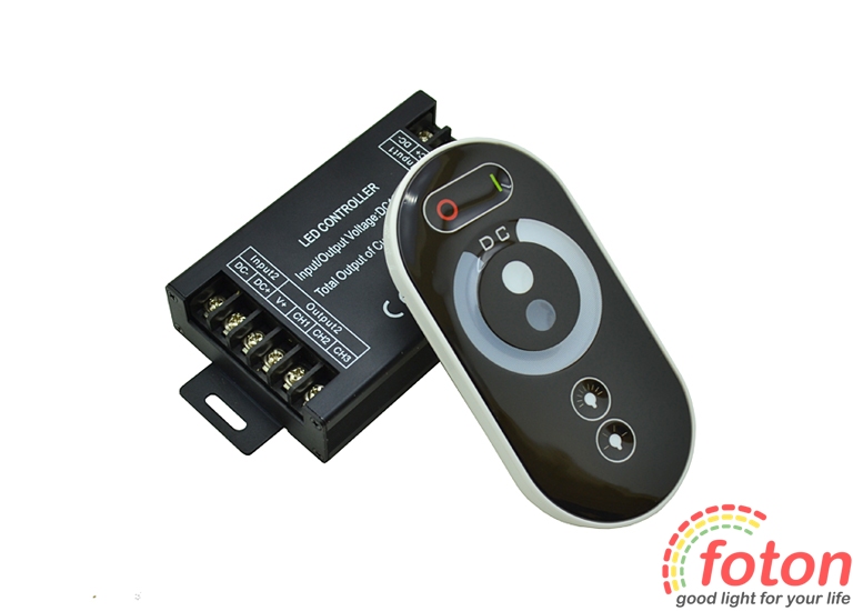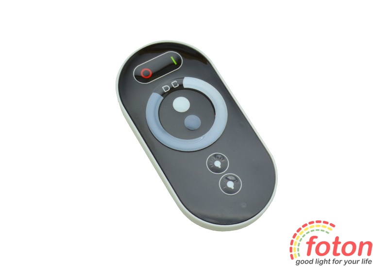 Діммер RF DMR 12V, 72A Black (Touch) для монохромної світлодіодної стрічки. Призначений для плавного регулювання яскравості світла світлодіодної стрічки в діапазоні від 10% до 100%. Також, цей диммер має два динамічні режими в яких можна керувати швидкістю мерехтіння. Плавне регулювання яскравості виконується за допомогою сенсорного кільця. Радіус дії пульта 30 метрів.