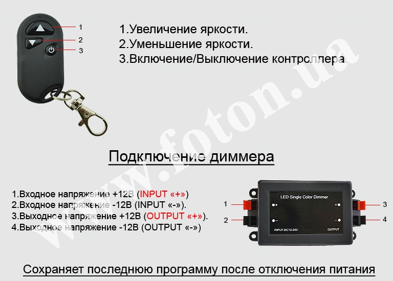 | Опис пульта та режимів димера: | RF DMR 12V, 8A |