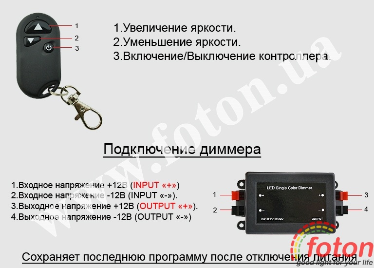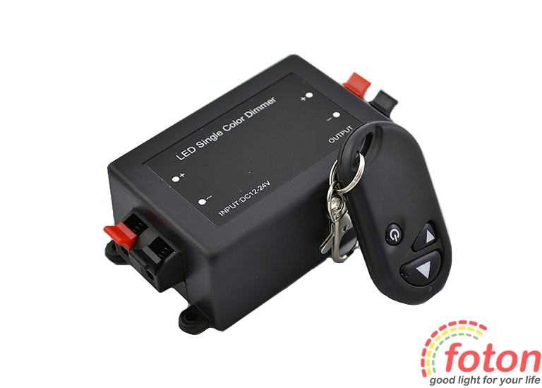Цей димер для світлодіодної стрічки розрахований на підключення до 6,5 м стрічки потужністю 14,4 Вт/м (), до 10м стрічки потужністю 9,6 Вт/м (SMD3528 120LED/m) і до 20м href="http://foton.ua/ua/catalog/svetodiodnye-lenty.html?filter=41,28,33">SMD3528 60LED/m).