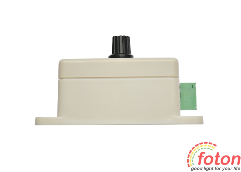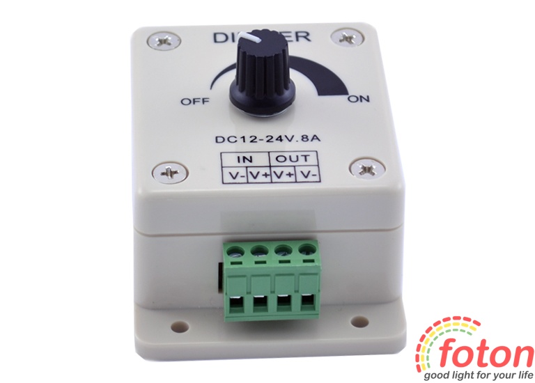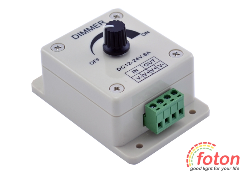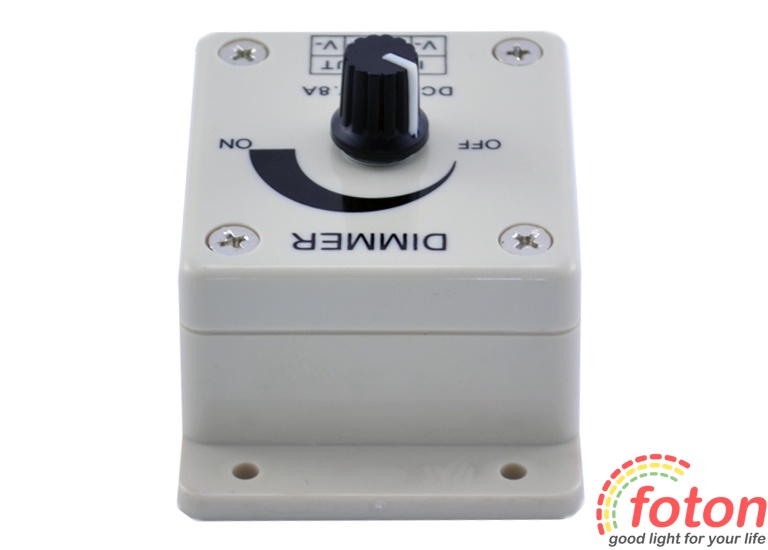 Діммер DMR 12V, 8A для монохромної світлодіодної стрічки.Призначений для плавного регулювання яскравості світла світлодіодної стрічки в діапазоні від 1% до 100%. Регулювання виконується вручну за допомогою регулятора на корпусі.