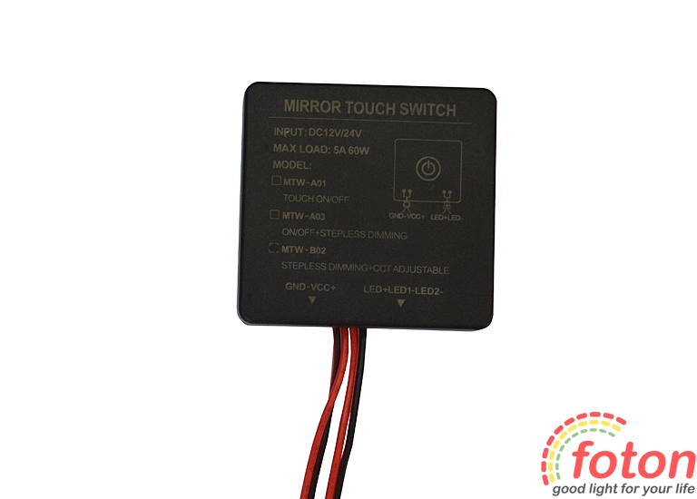 Mirror touch sensor Multi White FT-MTWB02 Black (dimmable) є сенсорною кнопкою в пластиковому корпусі. Дана сенсорна кнопка призначена для керування підсвічуванням для дзеркала. Призначена для прихованого монтажу. Максимальна потужність: 60 Вт. Робоча напруга 12 ст.