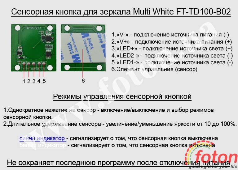 | Схема підключення: | Mirror touch sensor Multi White FT-TD100-B02 |