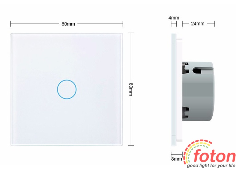 Сенсорний димер Livolo One touch виконаний з високоякісного гладкого скла. Технологія твердого покриття сприяє уникненню подряпин та сколів. Має стандартні розміри для монтажу у штатні отвори. Підсвічування сенсорної зони вимикача сигналізує його положення. Червоний – увімкнено, блакитний – вимкнено. Також, завдяки підсвічуванню легко знайти димери у темряві. Сенсорний світлорегулятор призначений для керування однією лінією навантаження з можливістю плавного регулювання яскравості світла.