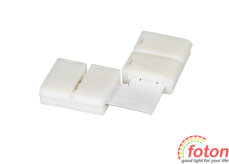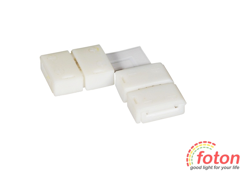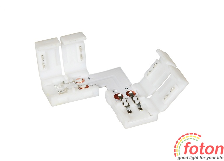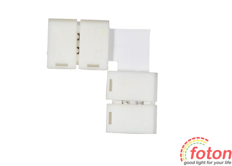 Коннектор кутовий для світлодіодних стрічок на світлодіодах SMD 3528. Даний конектор ідеально підходить для всіх типів світлодіодних стрічок SMD 352 Такі кутові конектори використовуються для з'єднання світлодіодних стрічок SMD 3528. У конектор вкладається світлодіодна стрічка і за допомогою затискного механізму закріплює контакти. Цей конектор має 2 роз'єми по 2 контакти. За допомогою конектора для з'єднання світлодіодних стрічок можна виконати монтаж без паяння. Він простий у застосуванні та мають невеликі габаритні розміри. Застосовуються для кутового з'єднання світлодіодних стрічок без паяння. Має фіксований кут напряму 90° Зверніть увагу! При використанні даного конектора зі стрічками SMD 3528 (120 LED/m) необхідно збільшити розмір контактних площадок, від контактів площадок. Це забезпечить більш ефективне та надійне з'єднання.