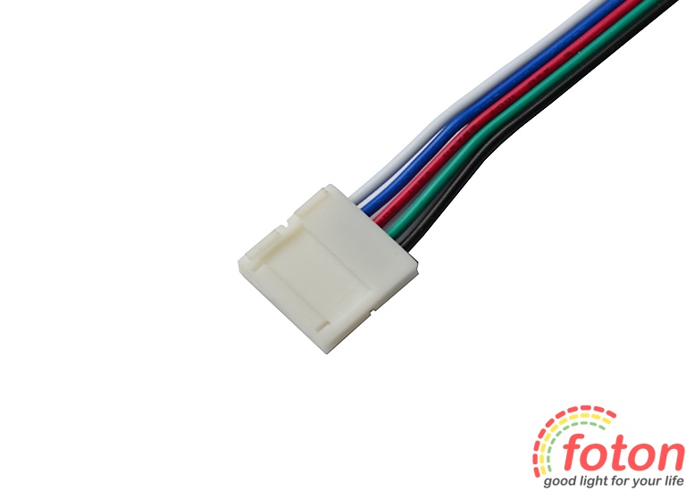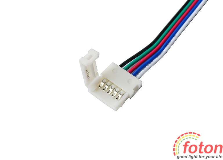Коннектор має пластикові основи всередині яких розміщені металеві клемні контакти, та дроти між ними довжиною 14 см. У конектор вкладається світлодіодна стрічка і за допомогою затискного механізму закріплює контакти. Даний конектор має 2 роз'єми в яких по 5 контактів.