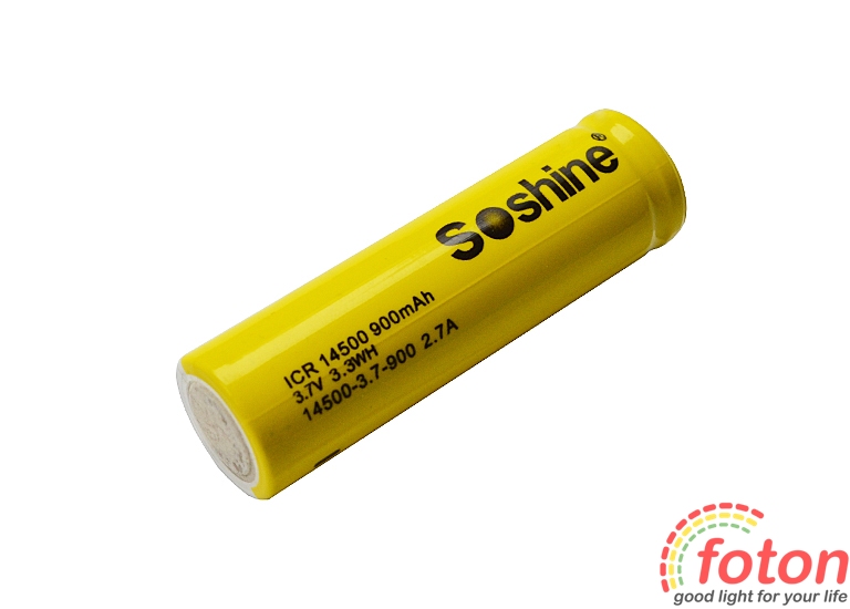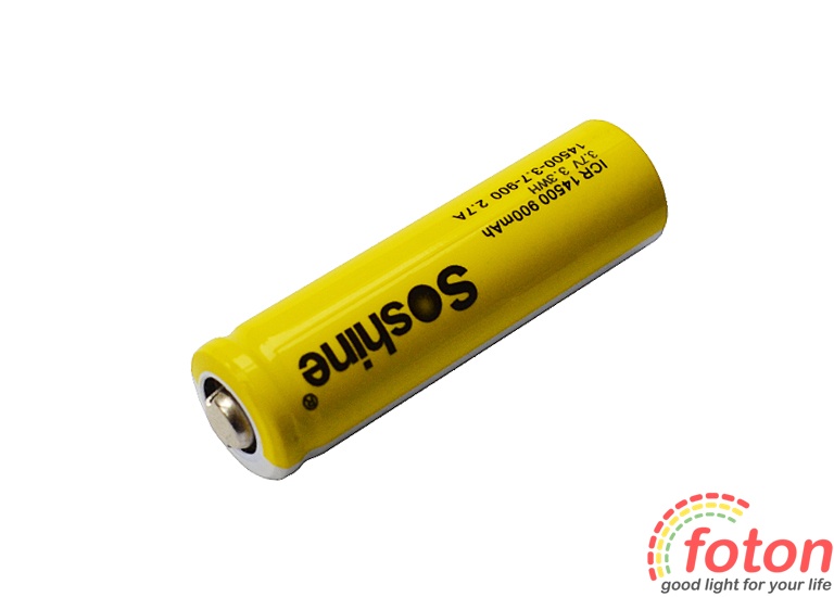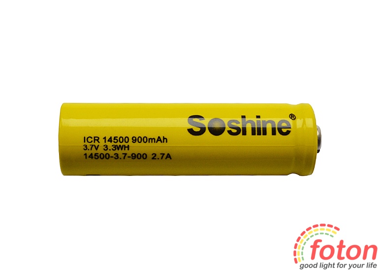 Літій-іонний акумулятор Soshine з типорозміром 14500, має ємність 900мАч та номінальну напругу 3,7В без захисту.