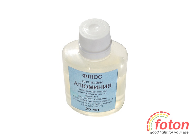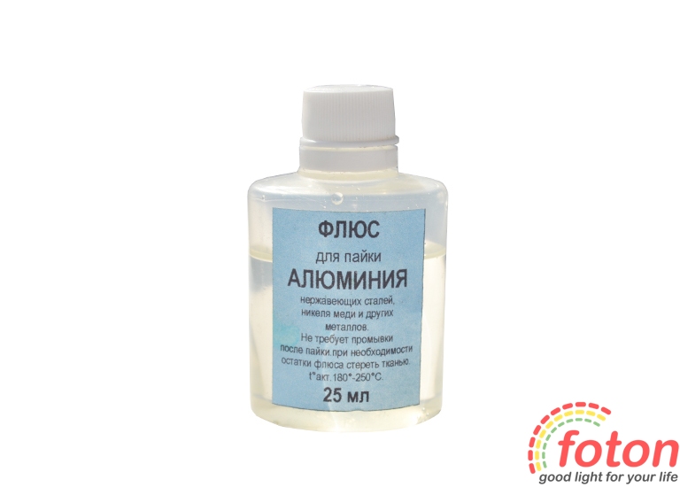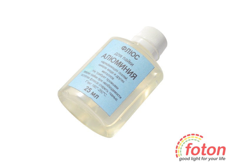 Флюс для паяння алюмінію немає у складі кислот. Поставляється у флаконі об'ємом 20 мл. Флюс не викликає утворення корозійної плівки. Залишки флюсу можна не видаляти, але за потреби вони легко знімаються тканиною.