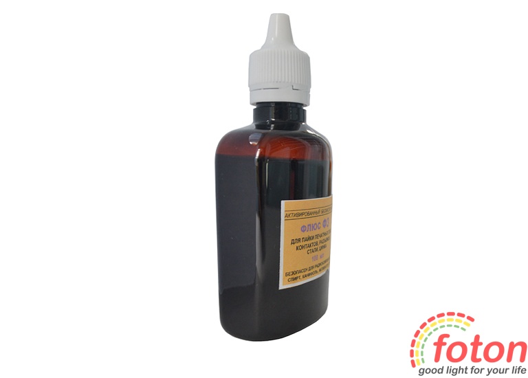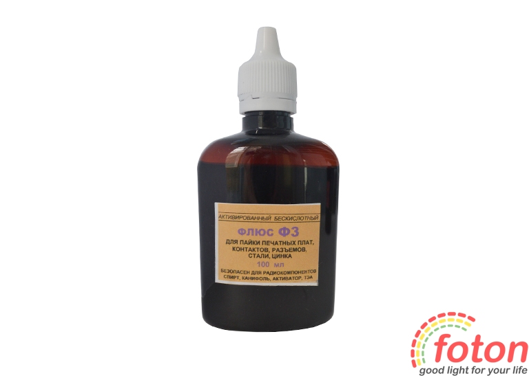 Флюс Ф-3 є безпечним для паяння радіокомпонентів. Поставляється у флаконі об'ємом 100 мл. До складу флюсу входить спирт, каніфоль, активатор та триетаноламін.