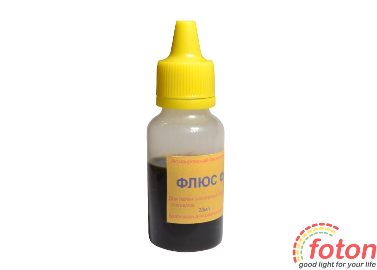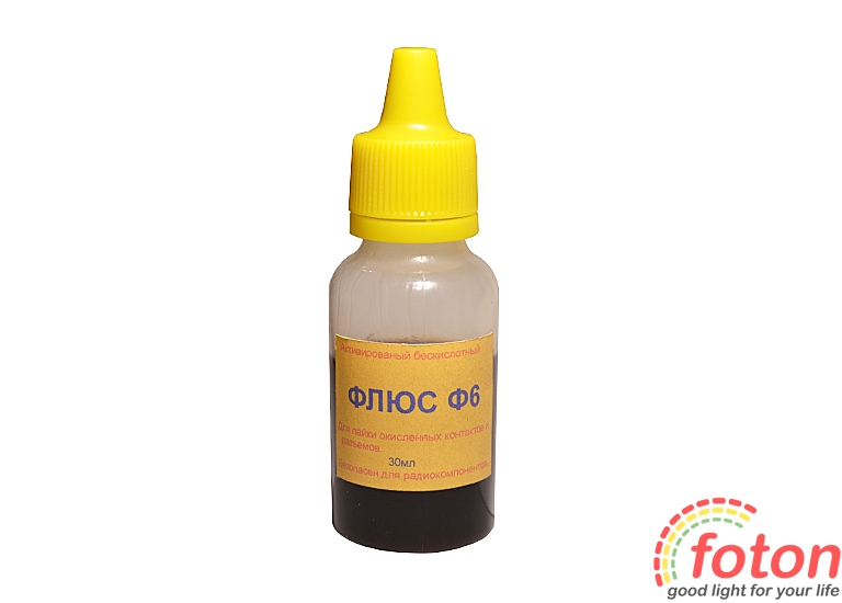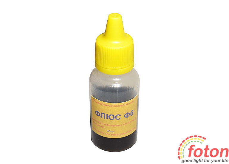 Флюс Ф6 поставляється у флаконі ємністю 30 мл. В склад входять: спирт, каніфоль, діетиламінхлорид.