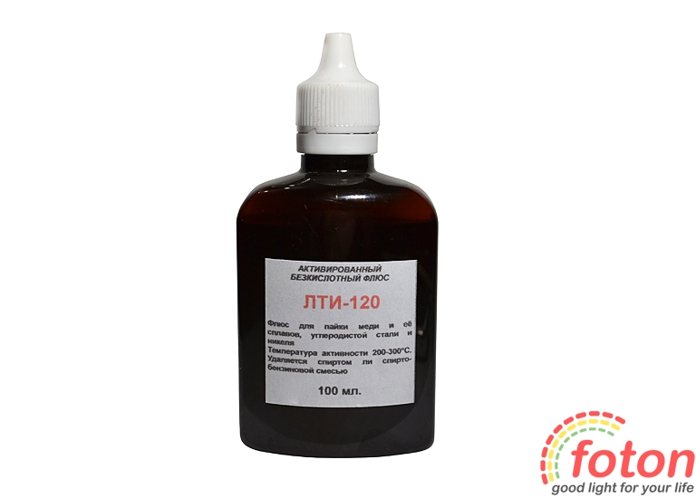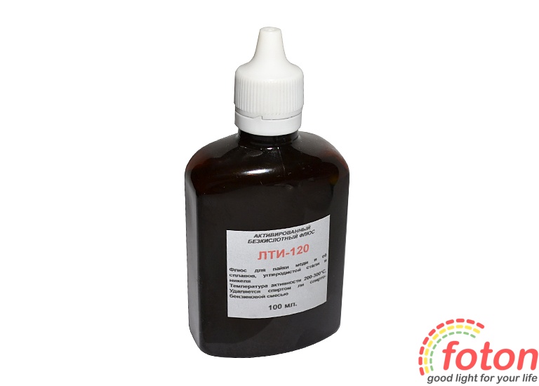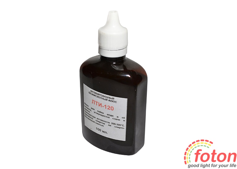 Флюс ЛТІ-120 є безпечним для паяння радіокомпонентів. Поставляється у флаконі об'ємом 100 мл. До складу флюсу входить спирт етиловий або ізопропіловий (63-74%), каніфоль соснова (20-25%), діетиламін солянокислий (3-5%), триетаноламін (1-2%)
